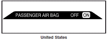 When the ignition key is turned to RUN or START, the passenger airbag status indicator will light ON and OFF, or the symbol for on and off, for several seconds as a system check. Then, after several more seconds, the status indicator will light either ON or OFF, or either the on or off symbol to let you know the status of the right front passenger’s frontal airbag.